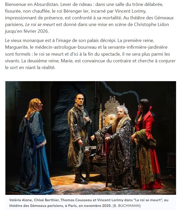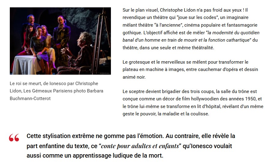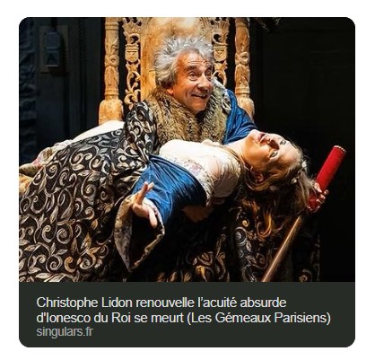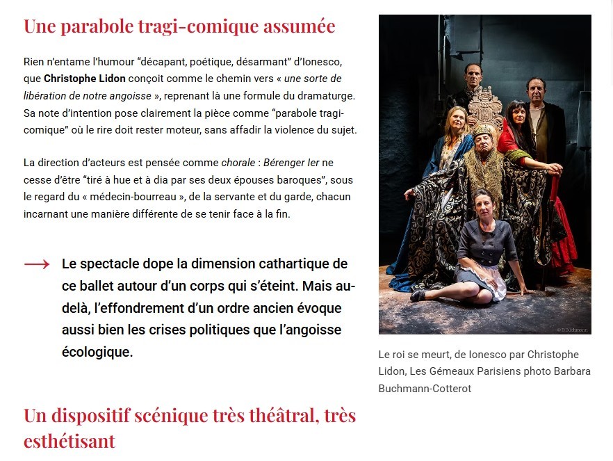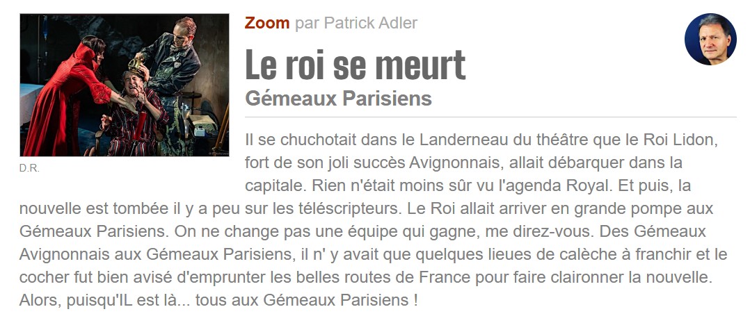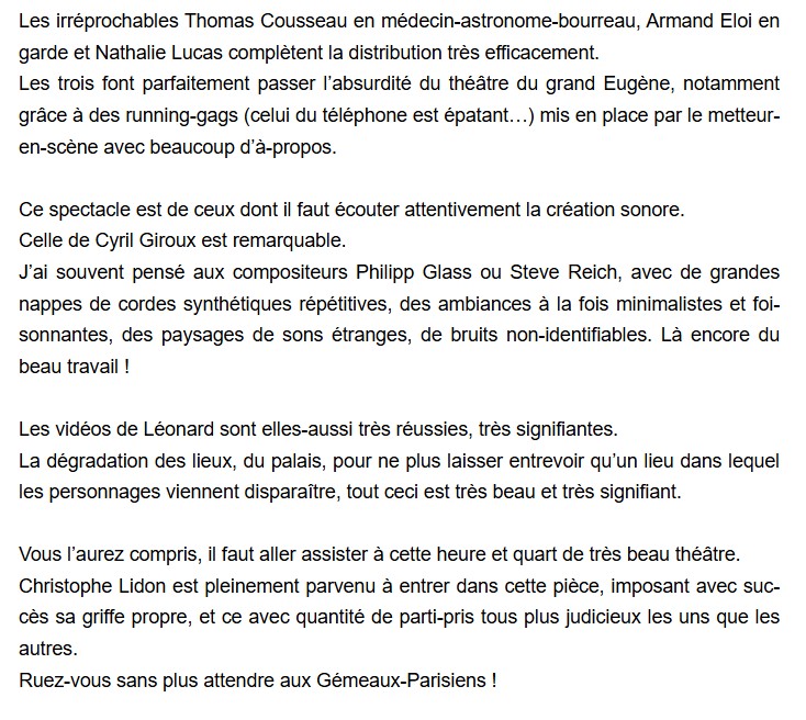 Son interprétation de Bérenger est exceptionnelle de fragilité et de tragique. On reconnait dans tous les caractères qui entourent ce roi la parfaite maitrise de la direction d’acteurs de Christophe Lidon. Il émane de la part de toute la troupe une jubilation et une parfaite écoute qui fait mouche à chaque instant sur le public. Une mise en scène qui fera date, à n’en pas douter et qui mérite que vous vous y précipitiez. Jean-Pierre HANE