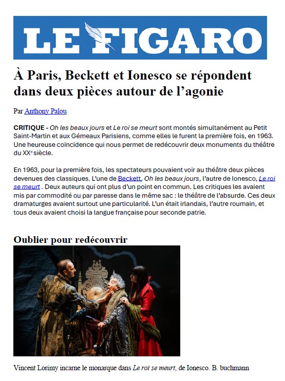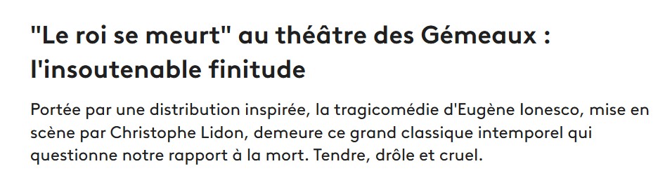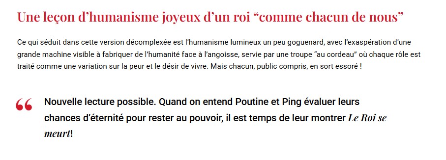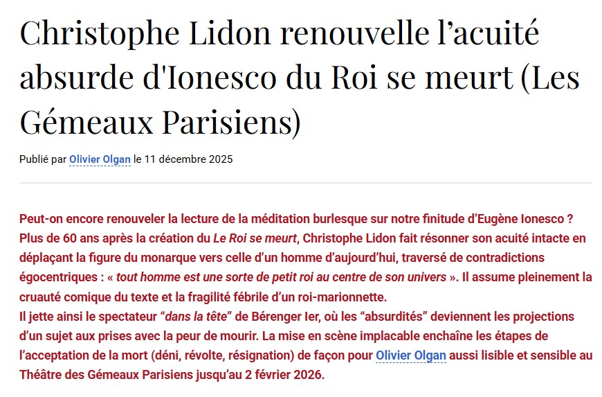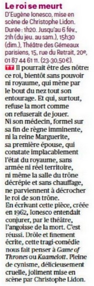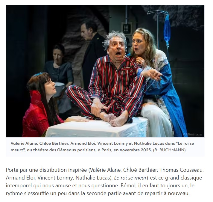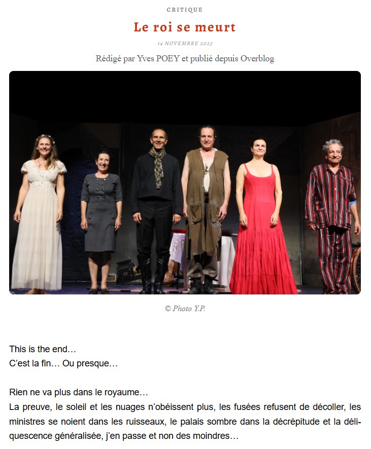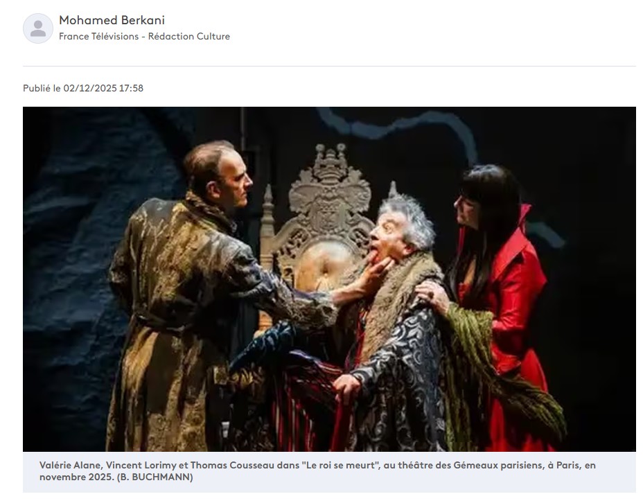 Son interprétation de Bérenger est exceptionnelle de fragilité et de tragique. On reconnait dans tous les caractères qui entourent ce roi la parfaite maitrise de la direction d’acteurs de Christophe Lidon. Il émane de la part de toute la troupe une jubilation et une parfaite écoute qui fait mouche à chaque instant sur le public. Une mise en scène qui fera date, à n’en pas douter et qui mérite que vous vous y précipitiez. Jean-Pierre HANE