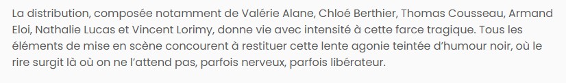 avec Valérie Alane, Chloé Berthier, Thomas Cousseau, Armand Eloi, Vincent Lorimy, Nathalie Lucas