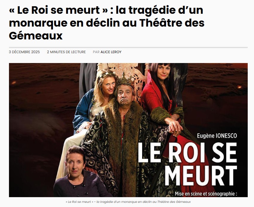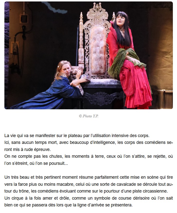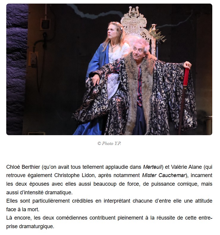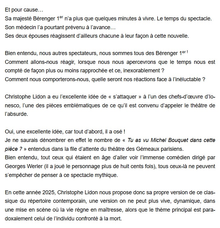 Son interprétation de Bérenger est exceptionnelle de fragilité et de tragique. On reconnait dans tous les caractères qui entourent ce roi la parfaite maitrise de la direction d’acteurs de Christophe Lidon. Il émane de la part de toute la troupe une jubilation et une parfaite écoute qui fait mouche à chaque instant sur le public. Une mise en scène qui fera date, à n’en pas douter et qui mérite que vous vous y précipitiez. Jean-Pierre HANE