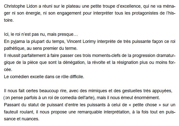 Les comédiens sont magnifiques, chacun d'entre eux est un symbole fort qui au fil de la pièce se détache du Roi.