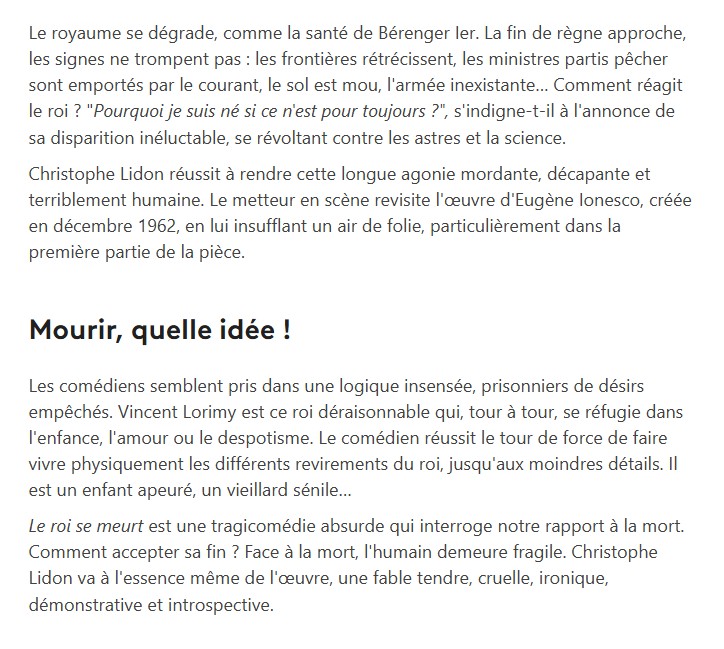 Eugène Ionesco a écrit cette pièce en 1962, elle occupe une place centrale dans son œuvre. Pilier du théâtre de l'absurde, Le Roi se meurt parvient à traiter de la mort avec une combinaison unique de gravité et d'humour.